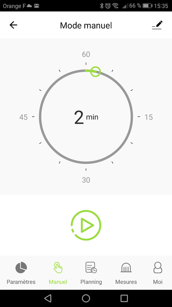 • Par cliquer-glisser sur le cercle vert du minuteur, vous pouvez régler le temps d'arrosage souhaité.
