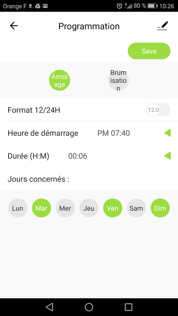 Dans l'exemple ci dessus, l'arrosage se fera le mardi, vendredi et dimanche.
