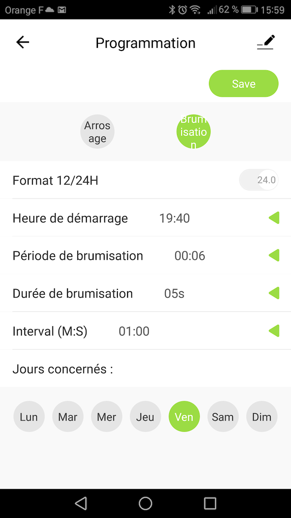 Suite à une limitation technique du système Tuya, les programmation peuvent se décaler de ± 30 secondes. Dans le cas de brumisations, il est recommandé de ne pas descendre en dessous de 1 minute à 1m30 que ce soit en terme d'intervalle comme de durée de brumisation.