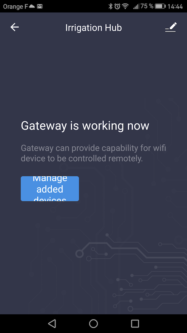 • Dans l'application, sur la page de confirmation, cliquez sur le bouton bleu "Manage added devices" (si vous étiez revenu sur la page d'accueil, il suffit de cliquer sur l'icône "irrigation Hub" pour arriver sur cette page)
