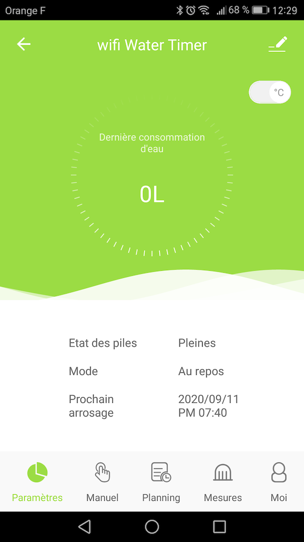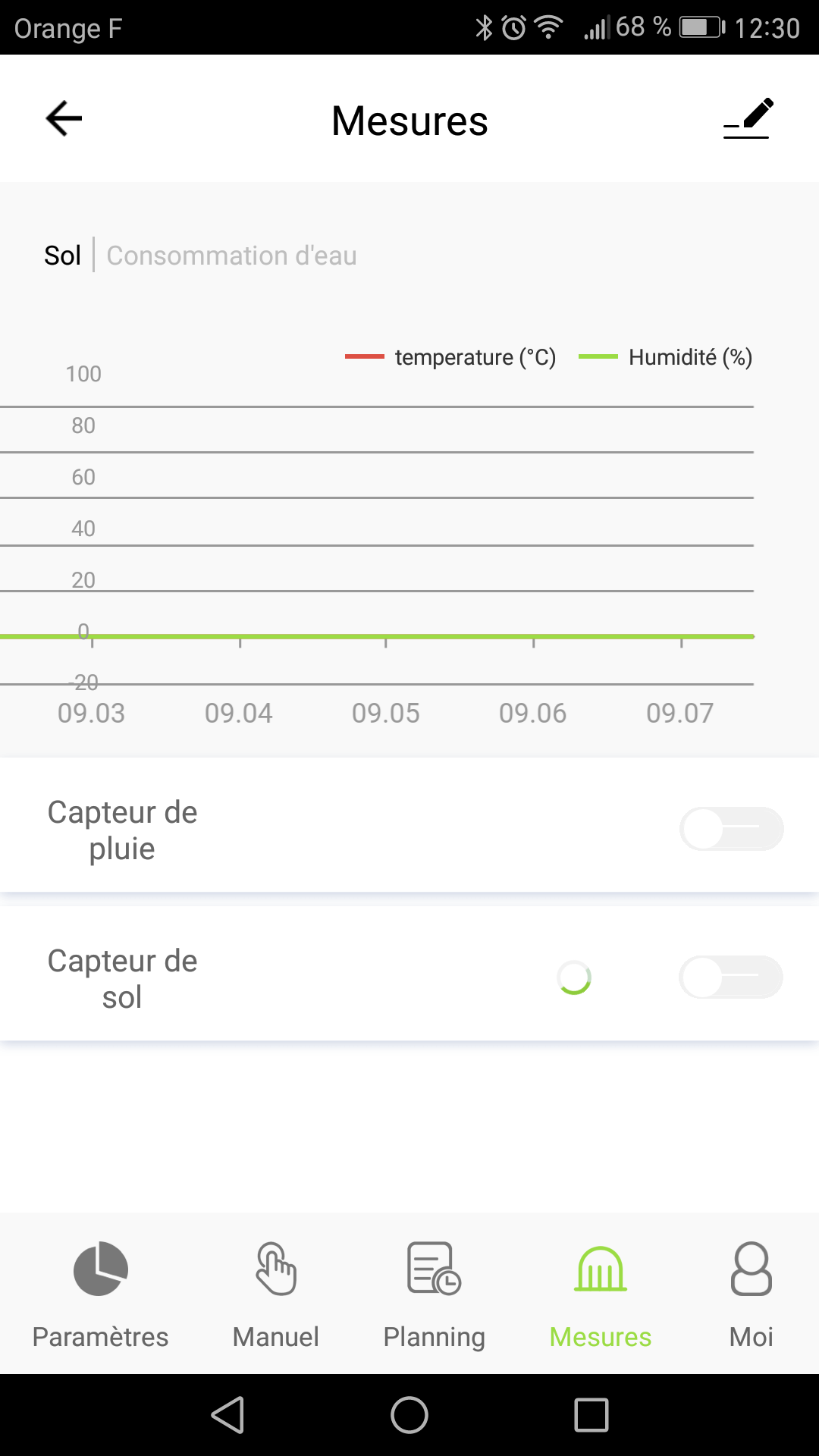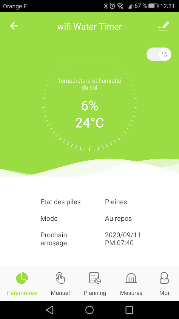 - A partir de cet instant, le capteur de sol transmet, toutes les 5 minutes, ses mesures de température et d'humidité relative. Vous pouvez suivre ces valeurs dans le graphique ou à partir de l'écran d'accueil de l'électrovanne sans fil:
