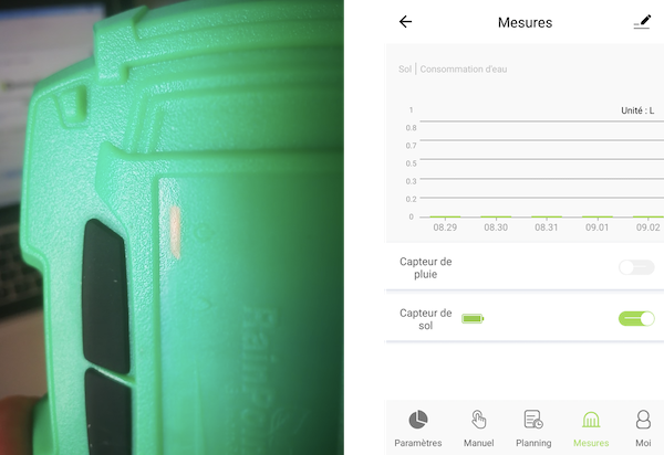 - Une led rouge en façade s'allume. Au bout de quelques secondes, vous voyez sur la page Mesures que le Capteur de sol est connecté (bouton activé et niveau de pile affiché) :