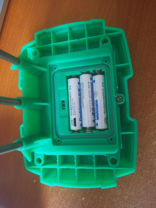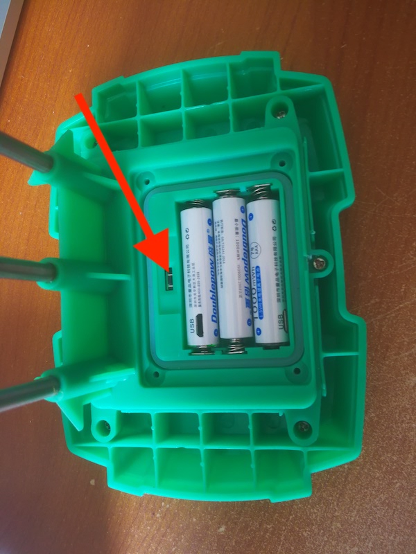 - A l'arrière du capteur de sol, appuyez au moins 5 secondes sur le petit bouton noir au dessus des piles.