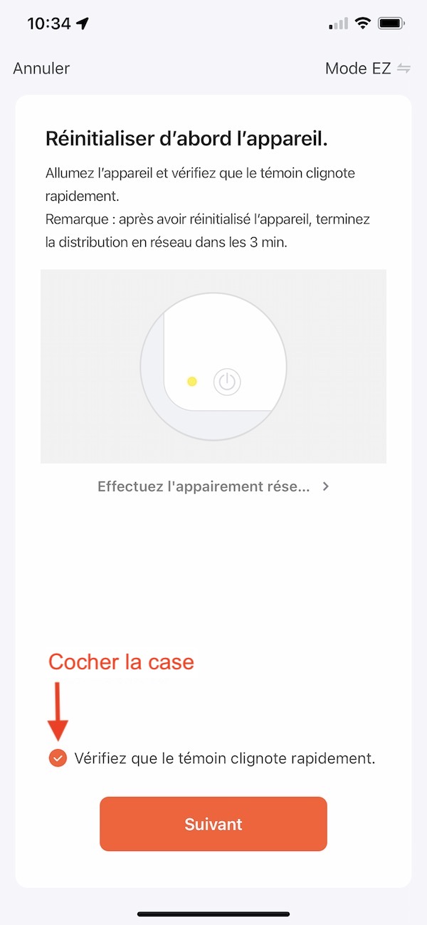 • Avant de cocher la case "Vérifiez que le témoin clignote rapidement", appuyez en haut à droite de l'application sur "Mode EZ" et sélectionnez à la place "Mode AP".