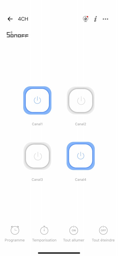 - Canal 1 à 4 : Permet d'allumer ou éteindre chacune des 4 sorties (le menu réglage permet de renommer les sorties)