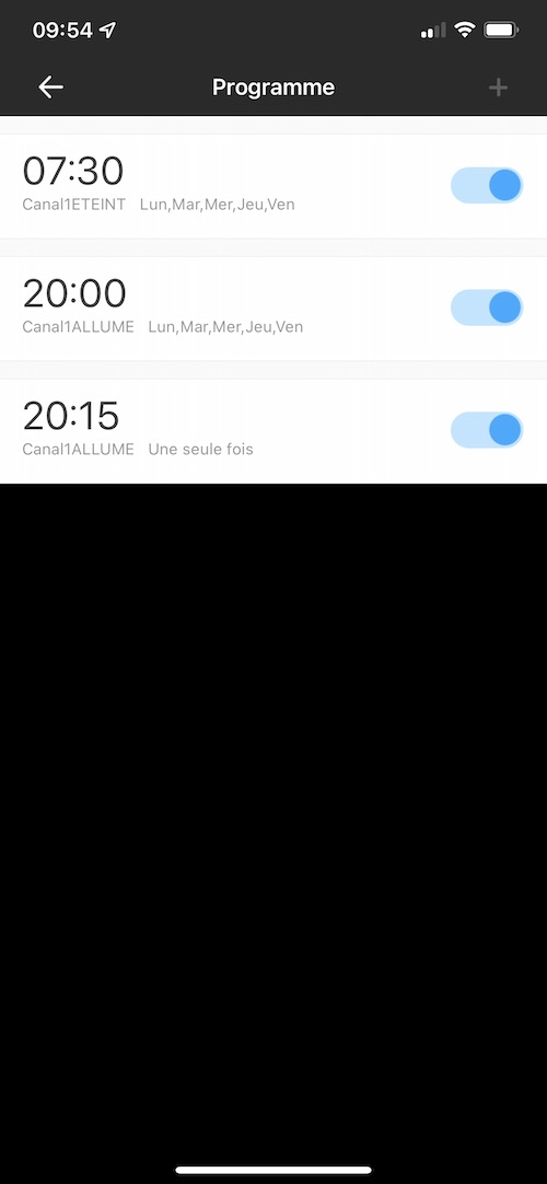 - Programme : permet de créer des programmations horaires marche ou arrêt pour chaque canal (avec possibilité de préciser les jours de la semaine concernés ou une exécution unique).