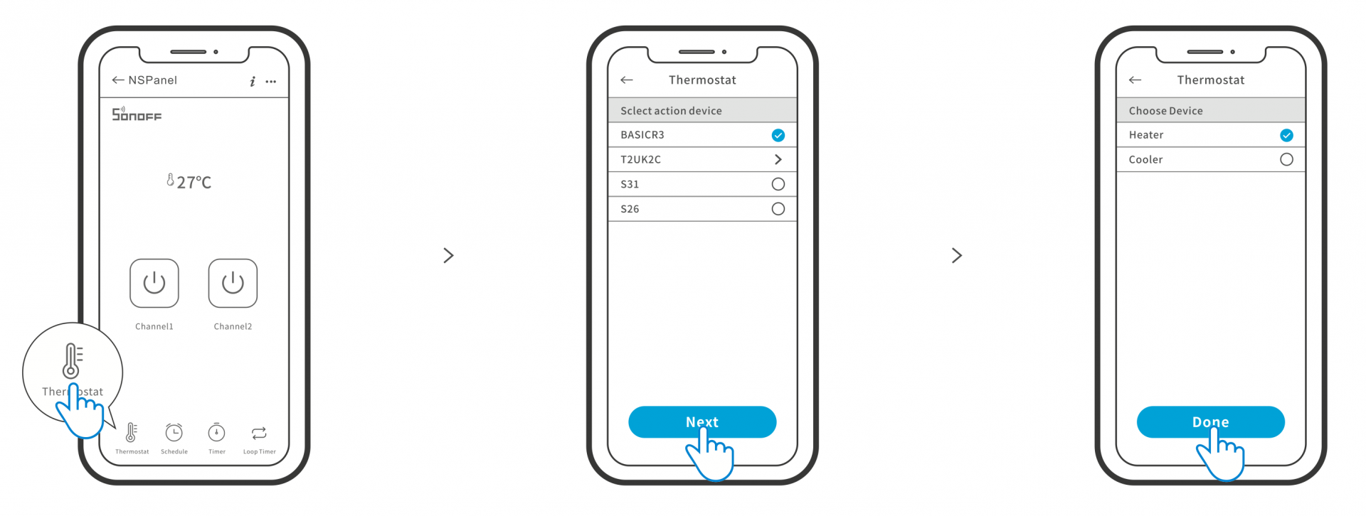Appuyez sur l'icône Thermostat, sélectionnez l'actionneur de puissance qui commande votre chauffage puis la fonction : "Chauffage" ou "Refroidisseur".
