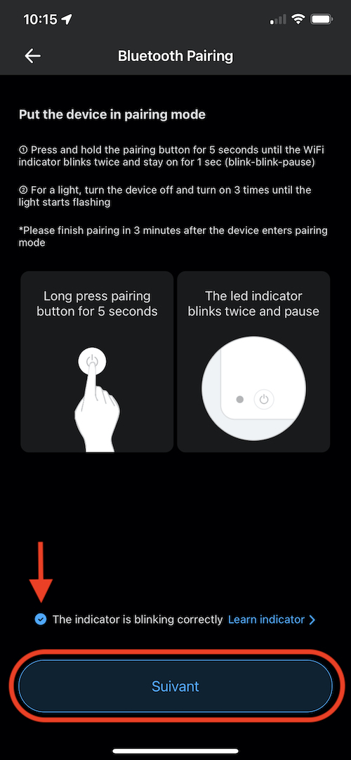 • Cochez la case "The indicator is blinking correctly" puis sur "Suivant"